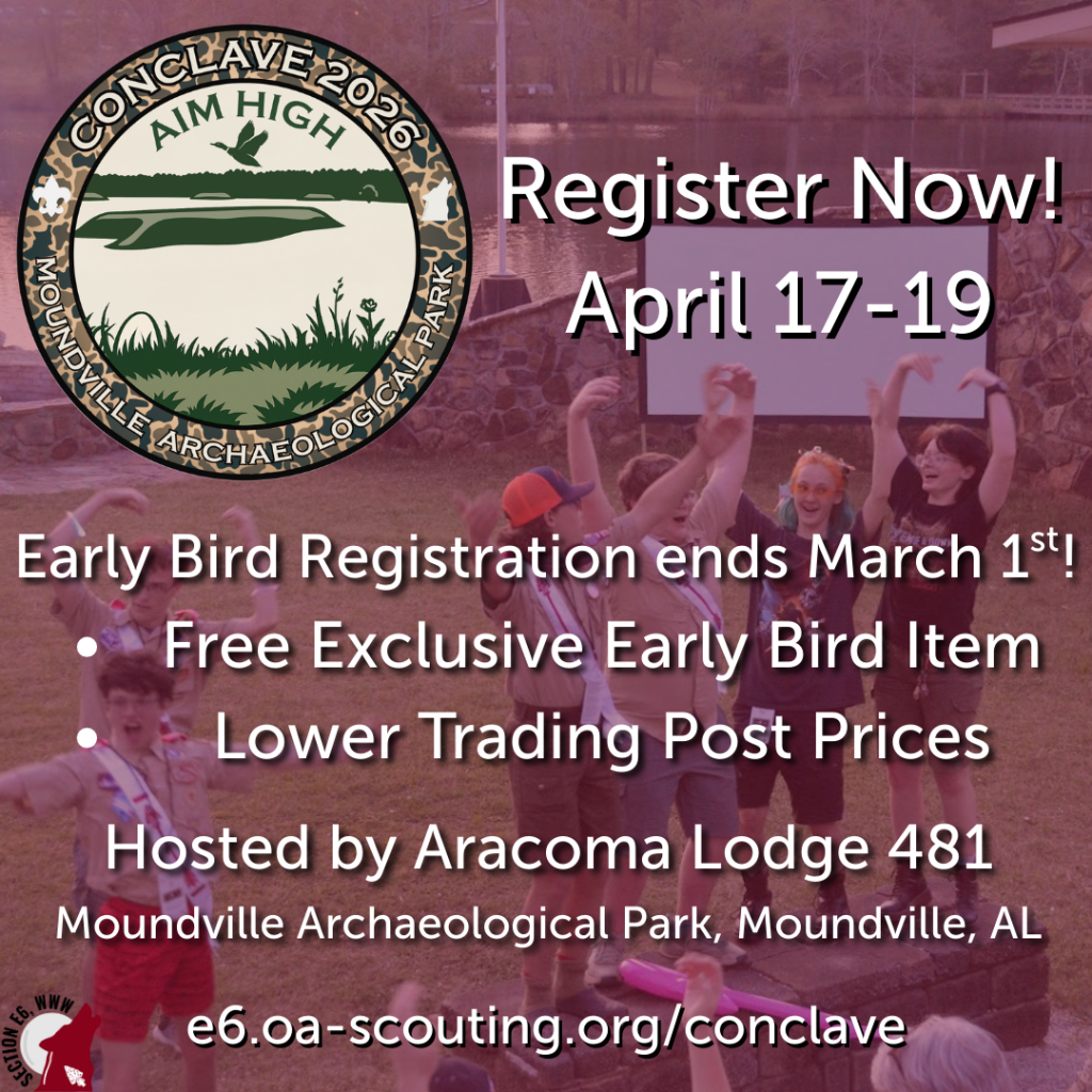 Registration is now open for the Section E6’s 2026 Conclave! This year’s Conclave theme is Aim High. Join us at Moundville Archaeological Park on April 17th – 19th for fellowship and competition with arrowmen from across Alabama and Georgia. Register now at the link below!